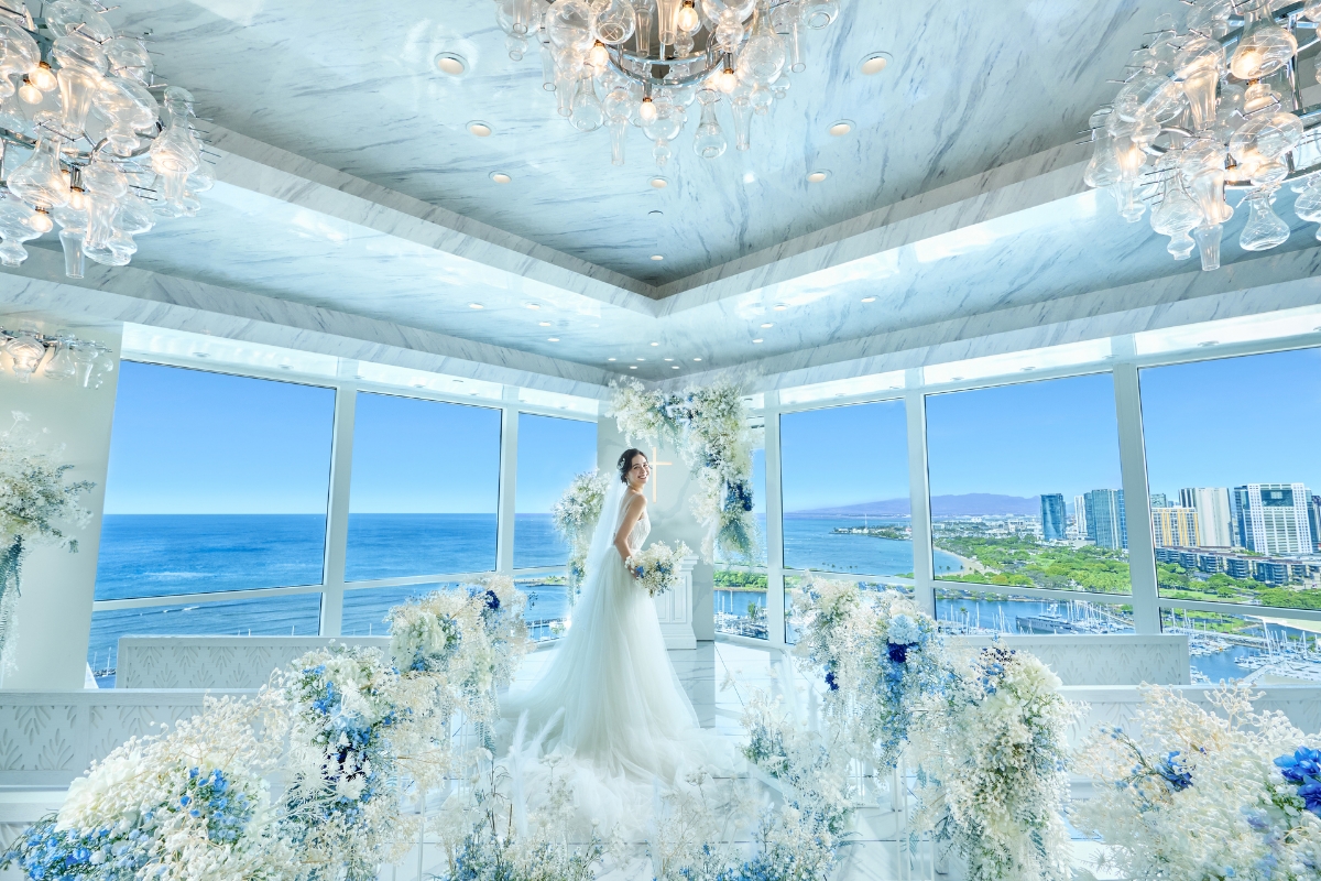 眼下に広がる青い海と空に包まれた、ハワイでも類を見ない「天空のチャペル」