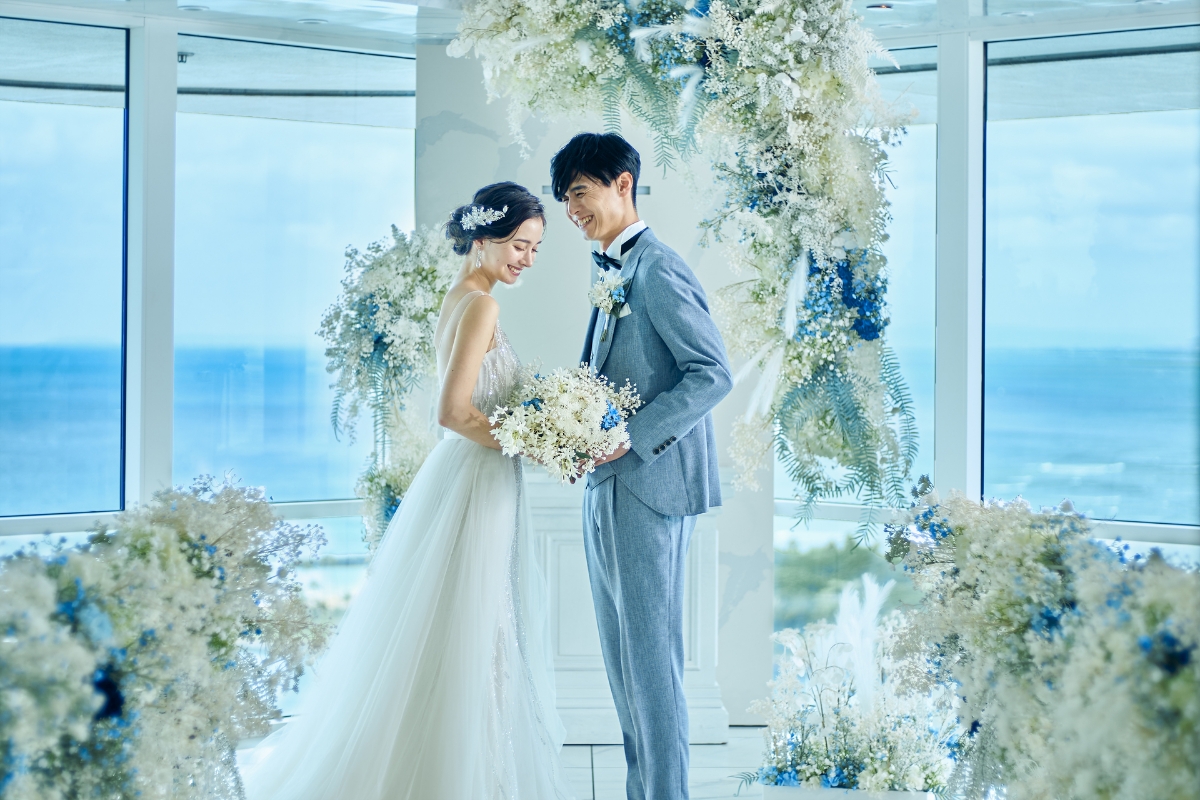 イリカイ・ホテル最上階で素晴らしいロケーションに恵まれたチャペルは、ピュアホワイトで統一されたエレガントな空間が広がります。 -